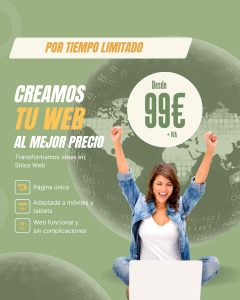 Estamos ofreciendo un diseño web de una sola página desde €99 (sin IVA). Esta promoción es una oportunidad única para obtener una presencia en línea de calidad a un precio asequible.